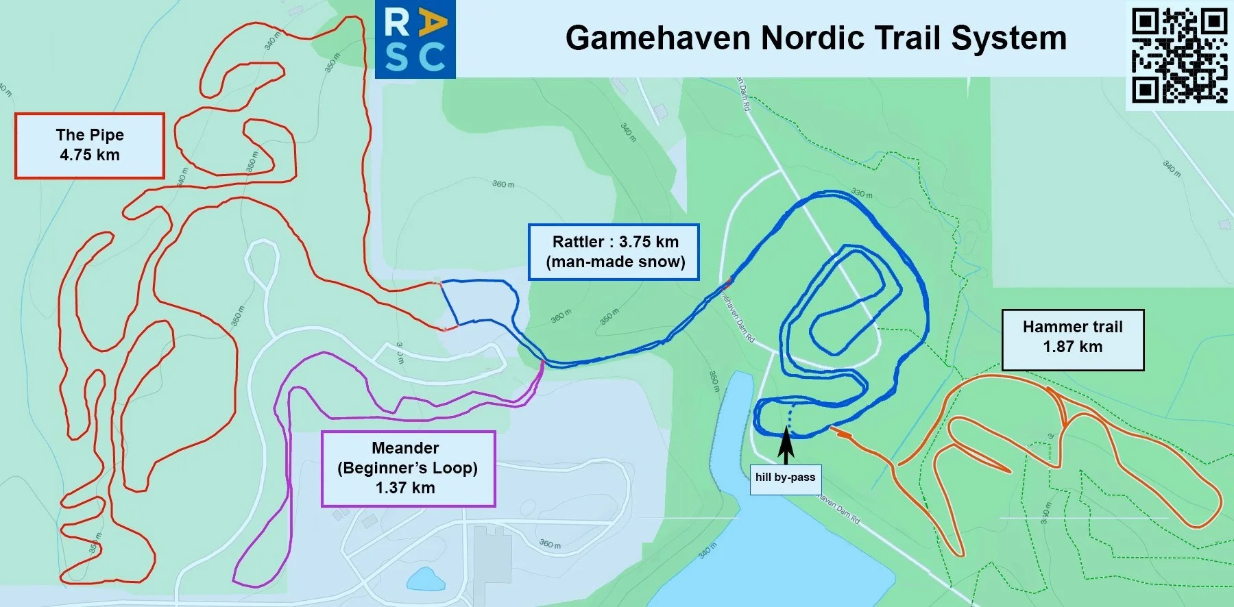 All trails can be accessed from either parking lot. While the upper lot is the main entrance, access to the machine-made loops from there is via an immediate, rather steep 90-foot drop. Skiers that prefer not to navigate that hill should access the trail via the lower lot. It is a short walk to the trails on a gravel access road from there. Natural snow trails are: The Pipe, 4.75 Km, intermediate level, Meander, 1.37 Km, beginner, and Hammer, 1.87 Km intermediate. Almost all trails are primarily in open terrain, and The Pipe and Meander can be quite windy, while lower Rattler and Hammer are in a bowl with more protection.