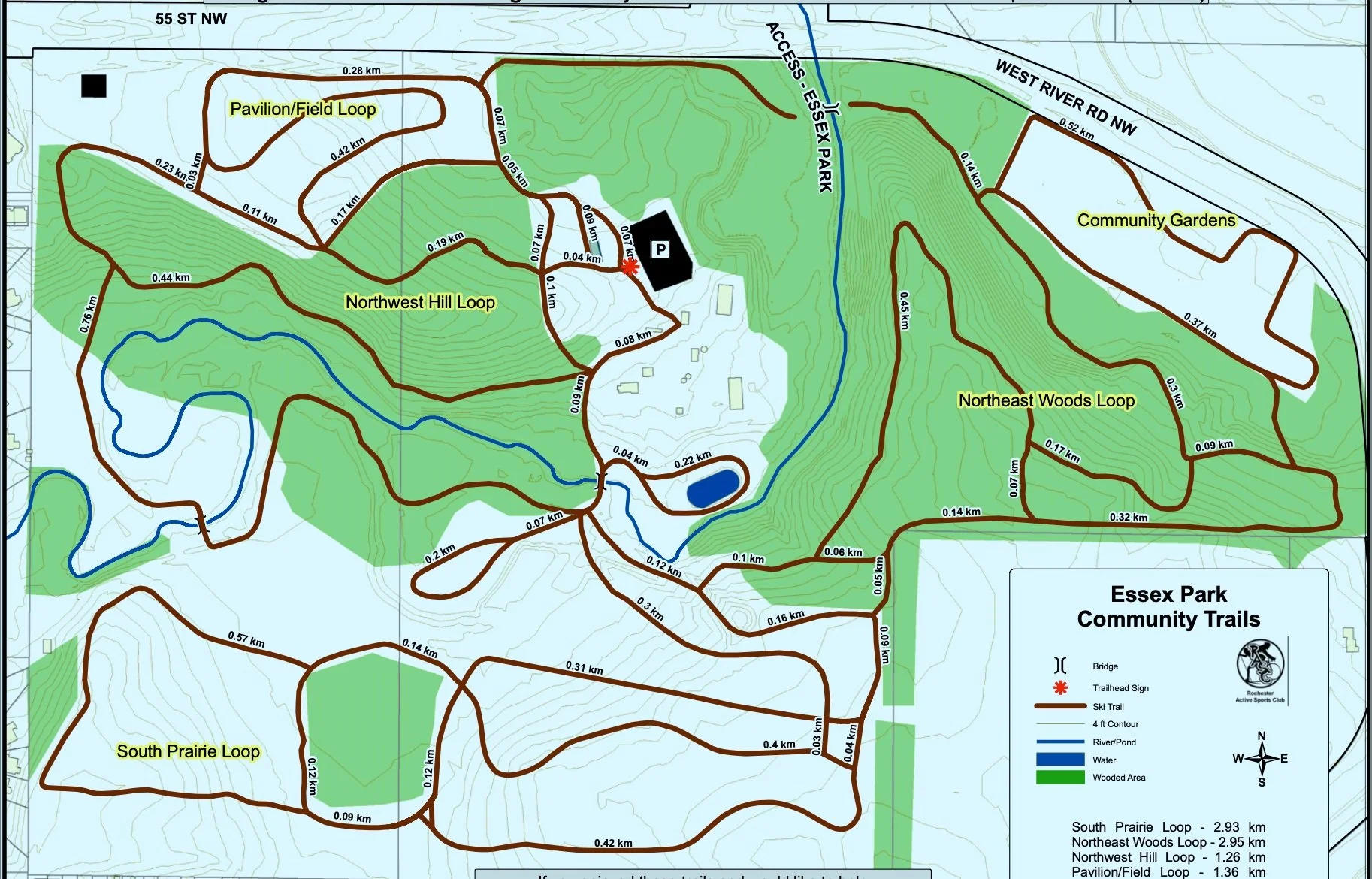 Essex Park has rolling terrain with few flat sections. Starting from the parking lot, most trails climb or descend, making it more of a challenge for beginners. Thanks goes to Bruce Walk, Jeff Robertson, Greg Rowley and many other volunteers for all their work in completing the trail system for winter skiing.
