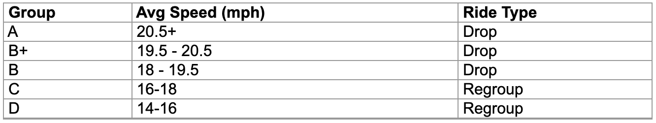 Both Monday and Wednesday road rides are divided into groups by approximate speed (see chart below).